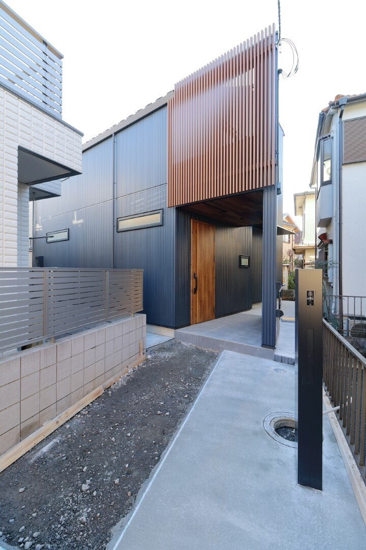 こちらの住宅は、建物の広さや高さに厳しい条件がある旗竿地ですが、外観は黒くシャープなデザイン、周囲の建物に隠れていても存在感を放っています。